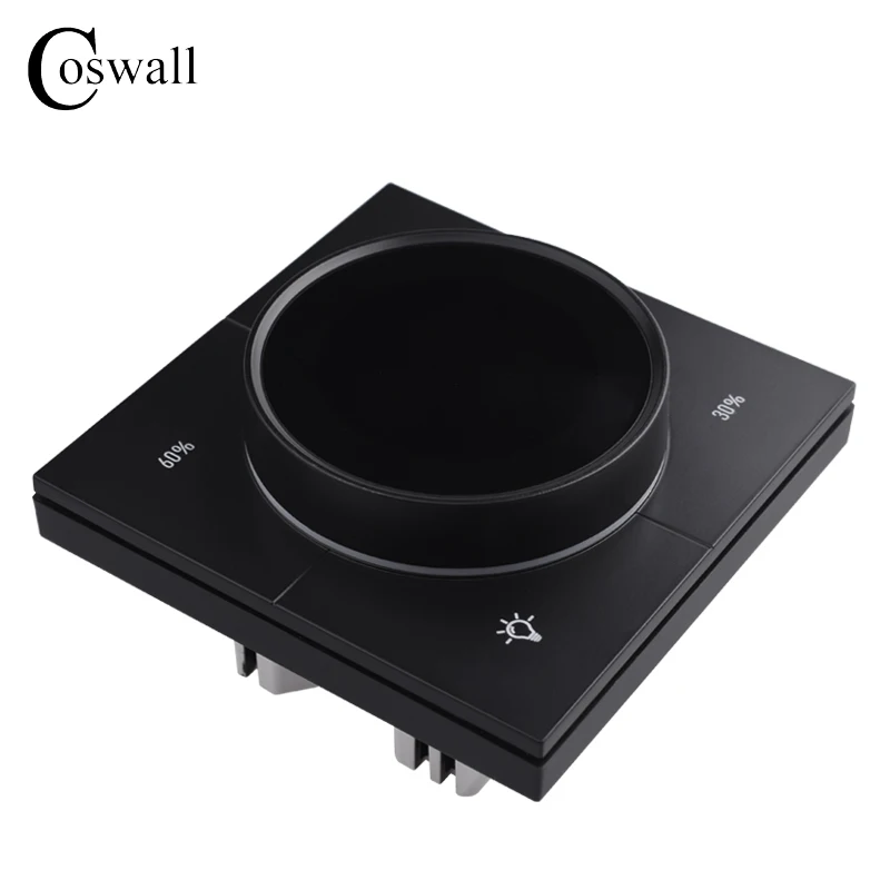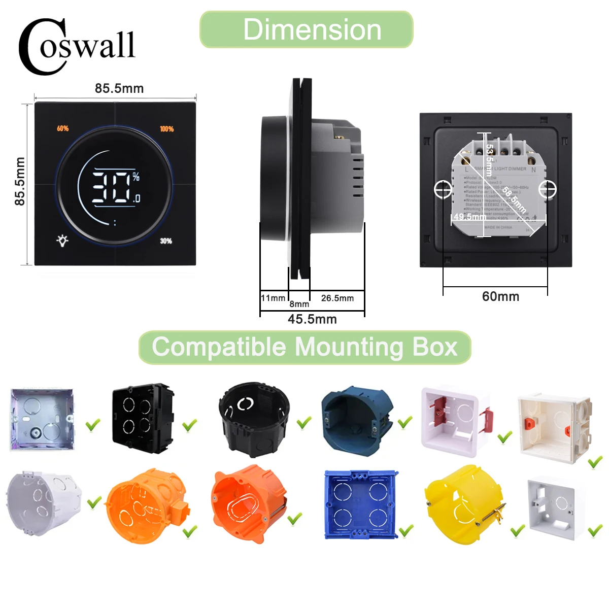 The PC panel digital LCD trailing edge dimming AC100 250V regulator features a refined 86mm by 86mm panel size. This standard format fits common installation boxes with 60mm distance. COSWALL Zigbee Dimmer is available in black, white, grey, and gold finishes, allowing easy matching with interior styles. The glass knob cover adds durability and a premium touch. Additionally, the plastic body meets CE and ROHS certification standards. Therefore, the design balances aesthetics, safety, and long term performance. This makes the dimmer suitable for both modern renovations and classic interiors.COSWALL Zigbee Dimmer Benefits