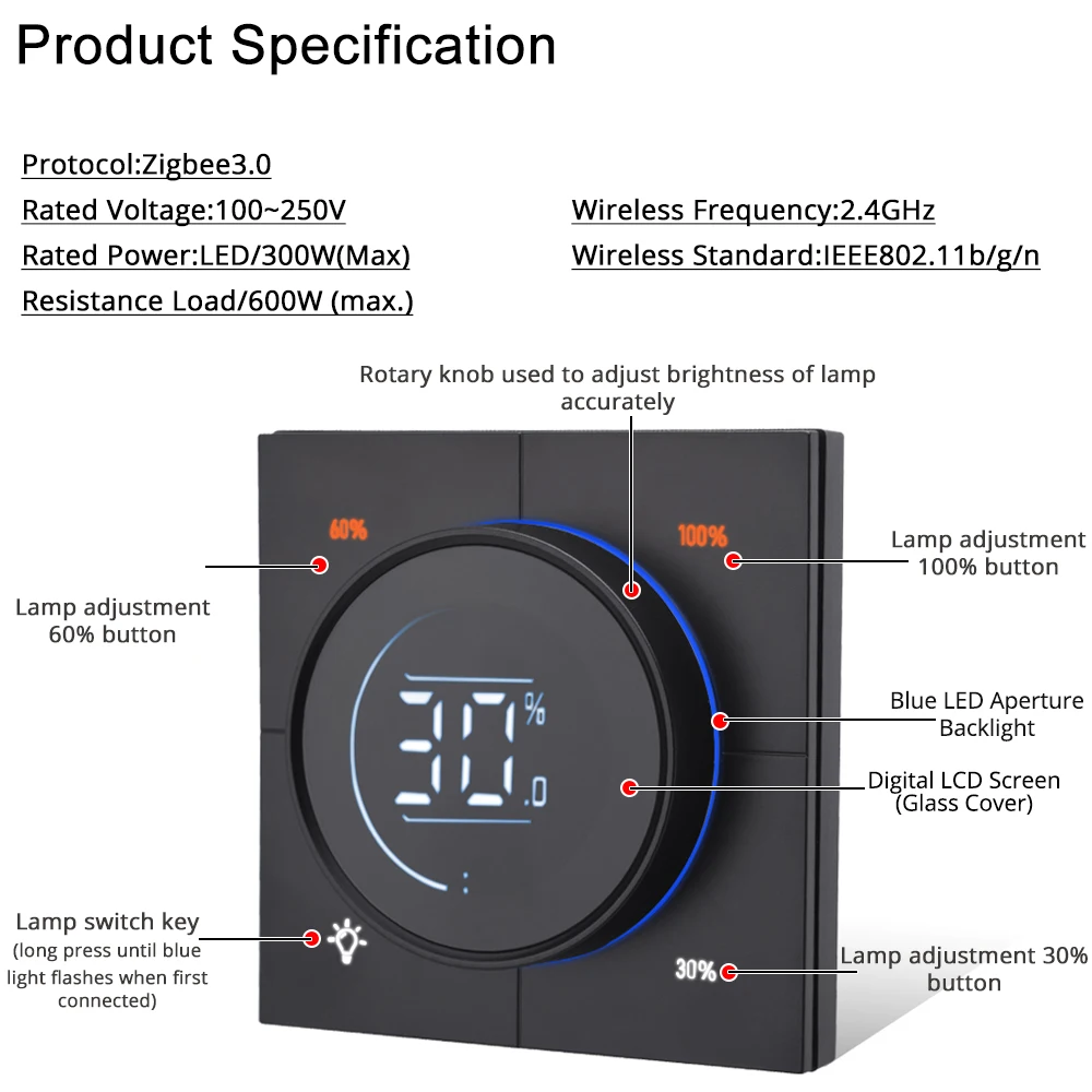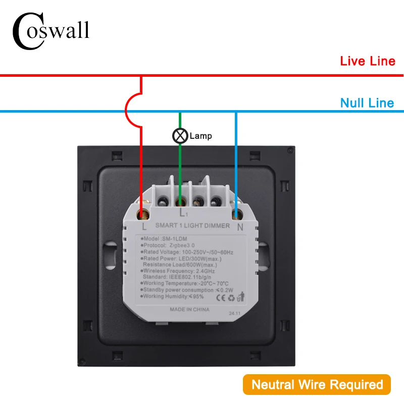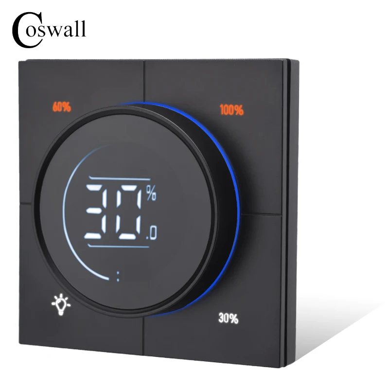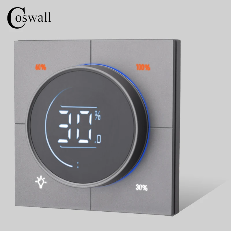 COSWALL Zigbee Dimmer is a modern wall light control solution designed for precise and comfortable lighting regulation in residential and commercial interiors. This infinite knob wall light dimmer with MOSFET control combines Zigbee 3.0 smart regulation and a clear digital LCD display to deliver smooth trailing edge dimming across AC100 250V networks. As a result, lighting stays stable, flicker free, and visually comfortable. Moreover, the PC panel design fits modern interiors in the UK, United States, Canada, Australia, and European countries. COSWALL Zigbee Dimmer supports smart home systems and offers reliable performance for LED loads up to 300W and resistive loads up to 600W. Therefore, it suits both new installations and DIY upgrades.Infinite Knob Dimmer Control